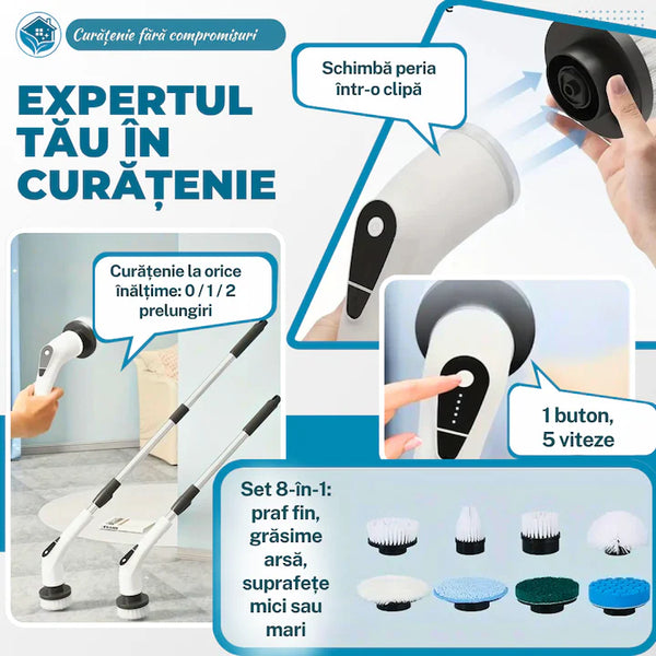 Peria electrică de curățenie 8-în-1 îți transformă munca în ceva rapid și fără efort. Cu un mâner telescopic extensibil, motor puternic și capete interschimbabile pentru orice suprafață, curățenia devine mult mai ușoară — fără frecare manuală și fără dureri de spate.